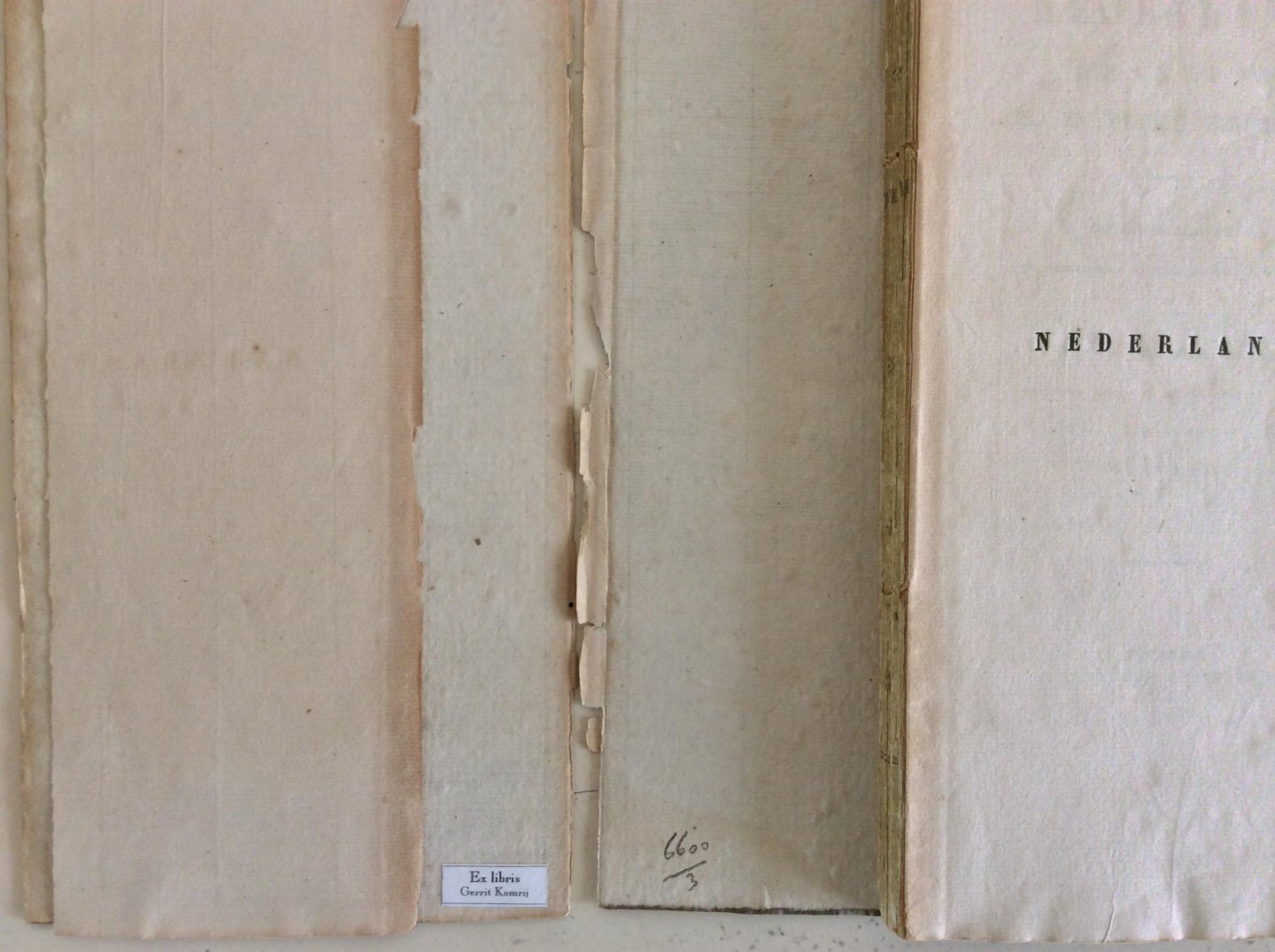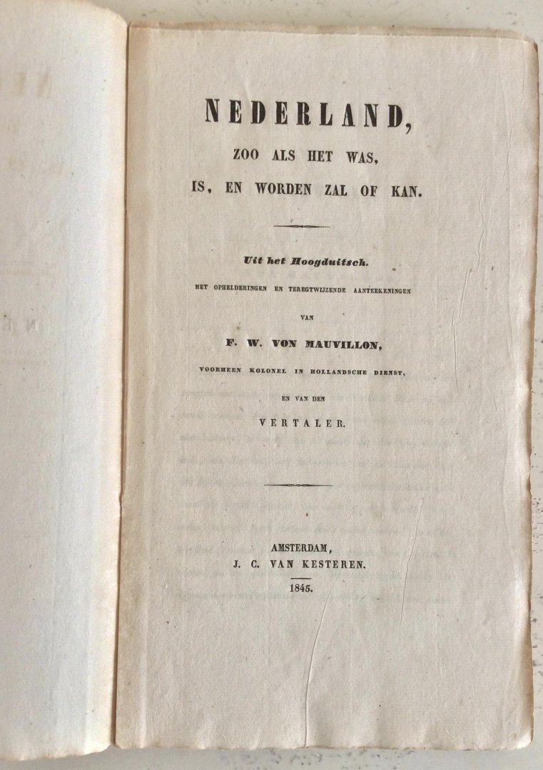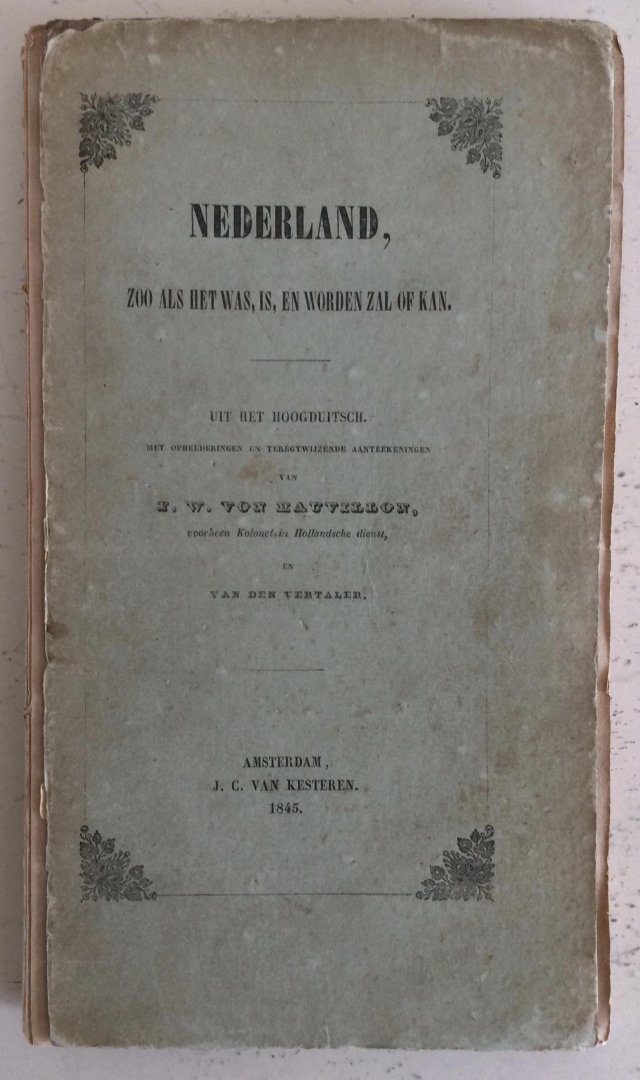Nederland zoo als het was, is, en worden zal of kan, Amsterdam J.C. van Kesteren 1845, 176 pp. Boekblok lig los van de kaft (zie foto's); zeldzaam. Ex libris van Gerrit Komrij |
