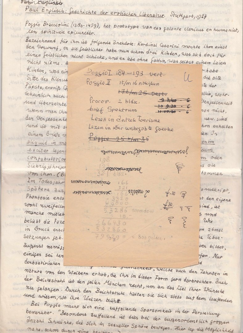 [1967] - Cahier [16 x 20,50 cm] met linnen rug. 118 (volle) pagina's handschrift, enkele lege bladen uitgescheurd + losbladig een tiental vellen (folio, meest recto/verso beschreven) met aantekeningen en nawoord\n* Het volledige manuscript, op de titelpagina rechts bovenaan gesigneerd: “Gerrit Komrij”. Onderaan de vermelding: “Oorspr. tekst: de tweetalige editie van Isidore Liseux. Parijs, 1878”.\nAchter in het cahier hield Komrij met doorgekruiste hokjes de voortgang van de vertaling bij. Met daaronder de planning van de voortgang (maart 1967). Hij ontving vijftien gulden per duizend woorden.\nCf. Blom – Het fabeldier dat Komrij heet, p. 102.