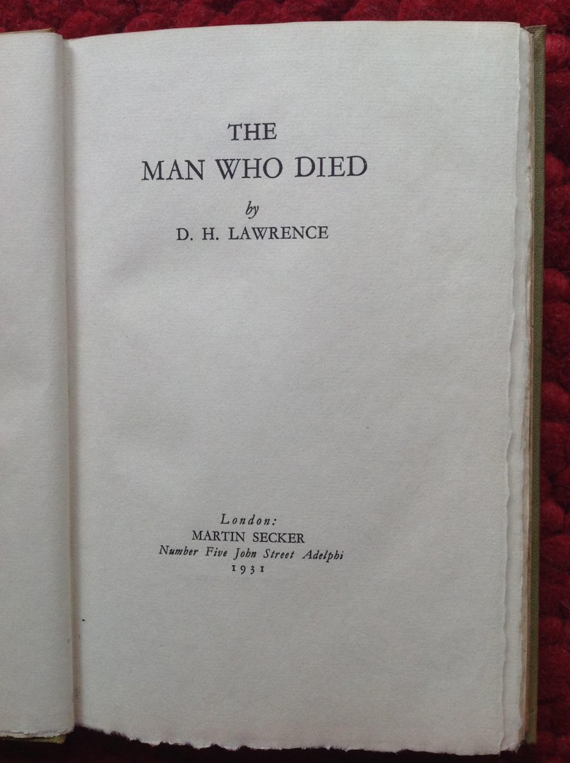 First English edition, one of 2000 copies. Original title of this story was The Escaped Cock, present title selected by the Author shortly before his death. Pages clean, good condition. Foxing to endpapers. Top edge of text block gilt, remaining outer edges untrimmed. Clean, tight text block. |