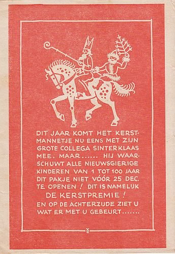 [Amsterdam, Wereldbibliotheek, 1955]. 20 x 14 cm. Ongebruikt Sinterklaasomslag voor de kerstpremie van de Wereldbibliotheek, Jules Renard, Natuurlijke Historietjes. Met drie plaatjes in roze gedrukt. Ongebruikt. Sinterklaas broederlijk samen met de Kerstman op dit cadeauomslag. Zonder het (zeer wijdverspreide) boekje, en daarom ook onbeschadigd.
