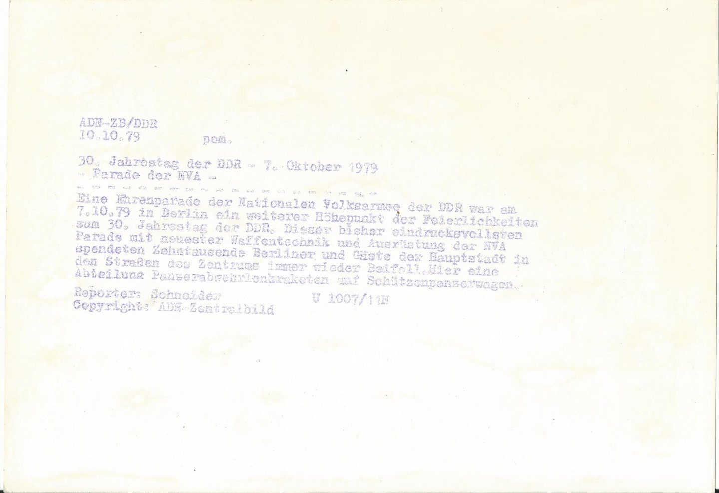 | Titel: | Persfoto. Parade der NVA (Nationale Volks Armee) t.g.v. 30-jarig bestaan van de DDR op 7 oktober 1979 op de Karl Marx-allee in Berlijn. |