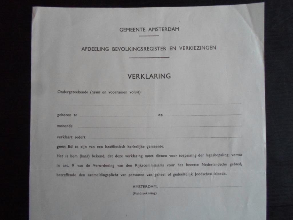 | Titel: | Verklaring van al dan niet lid zijn van de Nederlandsch Israelietische Gemeente nav de verordening van den Rijkscommisaris van het bezette Nederlandsche gebied betreffende de aanmeldingsplicht van personen van geheel of gedeeltelijk Joodschen bloede |