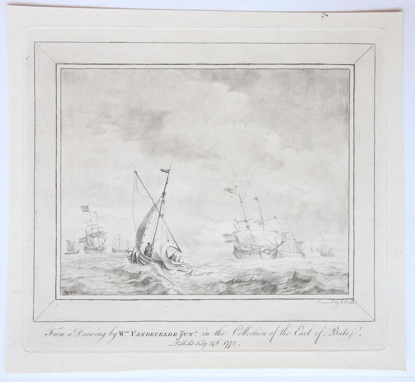 | Bijzonderheden: | Ships in open sea, after a drawing by Willem van de Velde II, as from the title: 'From a Drawing by W.m VANDEVELDE JUN.r in the collection of the Earl of Butel. / Publishd feb.y 24th 1772 |