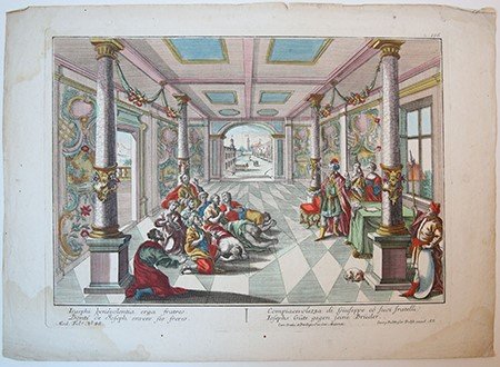 A hand coloured optical print depicting the biblical story (genesis 45) of Joseph's kindness to his brothers. Situated in a highly decorated hall, Joseph, standing on the right side of the plate, talks to his brother. The group of brothers sit on the ground, holding their hands up in amazement, on the left side of the plate. The surroundings are coloured in light pastel-like colours, while the clothes of the people are of more vibrant colours.