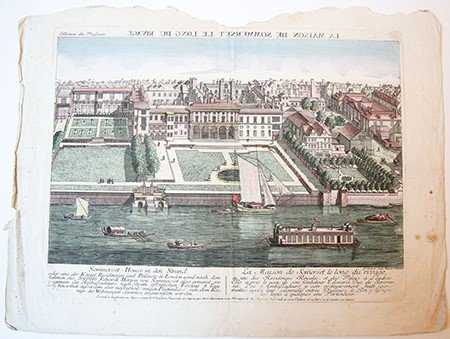 | Meer info: | Birds-eye view on the Somerset House in London, England. As seen from the water, with the garden in the front and the house in the distance. Beautifully hand coloured in pastel-like colours. (Londen) |