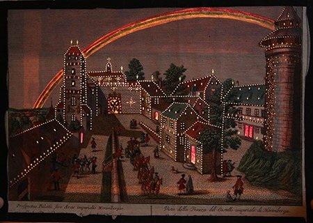 Beautiful hand coloured and illuminated optical print of the courtyard of Nuremberg castle in Germany. As seen from left to right; The Heidenturm (Heathen Tower), Kaiserkapelle (Emperor's Chapel), Tiefer Brunnen (Deep Well) and the Sinwellturm (Sinwell Tower). A large rainbow crosses the sky. This print is hand coloured in deep and vibrant colours, with an eye for detail. The light sources and accents of the buildings are perforated (dots and figures). At the back of the print we see that the holes are covered with see-through paper. Some of the holes are coated with green, yellow, pink and red paint. This gives the illusion of coloured lights when the print is held in front of a light source.