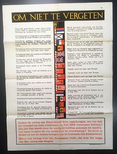 Londen, Johnson, Riddle & Co., [1917]. 76 x 55 cm. Groot tekstaffiche met kleurige landenwapens. Eenzijdig bedrukt. Gevouwen. Wat slijtage op hoekjes. Beschuldigend affiche waarin de daden van de Centralen tegenover de reacties van de Geallieerden worden geplaatst naar aanleiding van de bewering dat de Geallieerden Duitsland de oorlog heeft opgedrongen. Recentste datum: 6 april 1917. De opmaak doet enigszins denken aan die van het geïllustreerde (oorspronkelijk Britse) tijdschrift De oorlog in beeld (1916-1918).