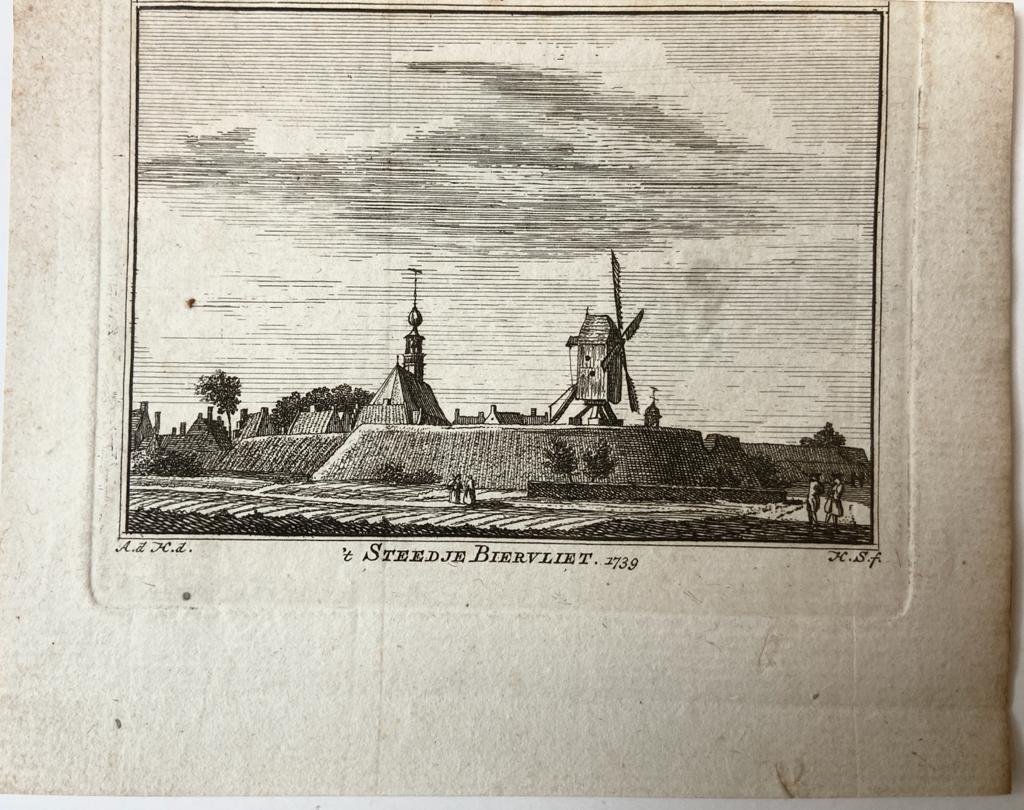 | Bijzonderheden: | Copperplate engraving/etching of ''t Steedje Biervliet', in the province of Zeeland in the Netherlands, as it appeared in 1739. Overall size: 104 x 132 mm; plate size: 80 x 108 mm. Good state. Some age related discolouration. Fold in the bottom ma... |