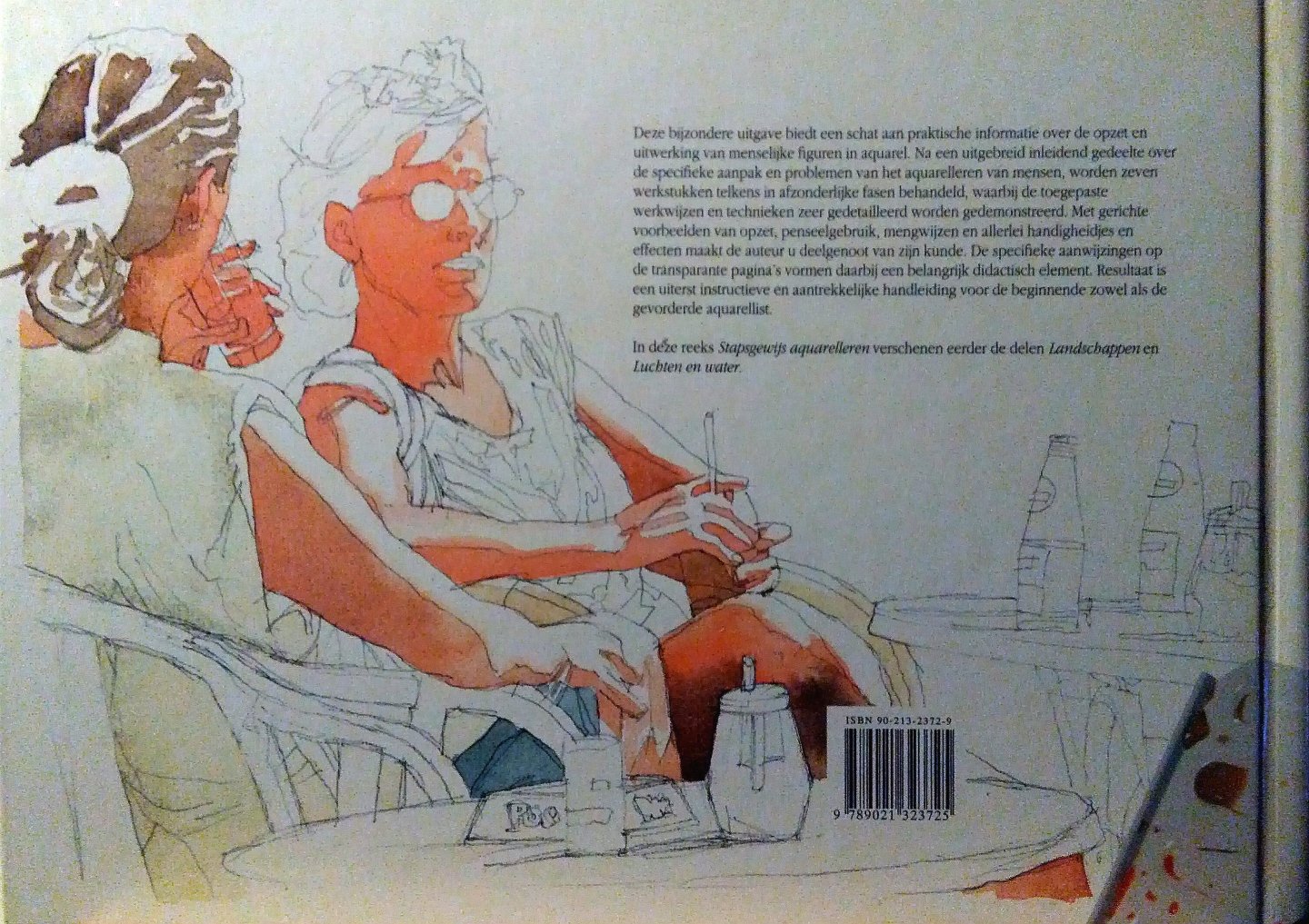 - het aquarelleren van mensen, worden zeven werkstukken telkens in afzonderlijke fasen behandeld, waarbij de toegepaste werkwijzen en technieken zeer gedetailleerd worden gedemonstreerd. Met gerichte voorbeelden van opzet, penseelgebruik, mengwijzen en allerlei handigheidjes en effecten maakt de auteur u deelgenoot van zijn kunde. De specifieke aanwijzingen op de transparante pagina's vormen daarbij een belangrijk didactisch element. Resultaat is een uiterst instructieve en aantrekkelijke handleiding voor de beginnende zowel als de gevorderde aquarellist.