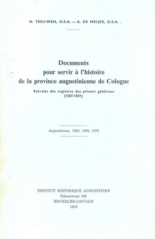 Documents pour servir a l'histoire de la province augustinienne de Cologne Extraits des registres des prieurs generaux (1507-1551) Augustiniana 1968, 1969, 1970 |