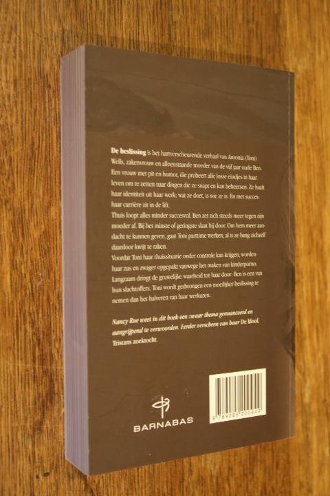 De beslissing is het hartverscheurende, maar knap geschreven verhaal van Toni Wells, een zakenvrouw en de alleenstaande moeder van de vijf jaar oude Ben. Een vrouw met pit en humor, die probeert alle losse eindjes van haar leven om te zetten in dingen die ze snapt en kan beheersen. Ze haalt haar identiteit uit haar werk; wat ze doet, is wat ze is. En met succes: haar carrière zit in de lift. Thuis verlopen dingen minder succesvol. Haar zoontje zet zich steeds meer tegen haar af. Bij het minste of geringste slaat hij door. Zelfs in zijn dromen raakt hij extreem overstuur: als Toni hem eindelijk in slaap heeft, wordt hij steevast twee uur later wakker in een nat bed. Toni raakt met de dag meer gestrest door het vijandige gedrag van haar kind. Ze besluit parttime te gaan werken om Ben meer aandacht te kunnen geven. Als goede moeder kiest ze voor haar zoontje, al is ze doodsbang om zichzelf door deze keuze kwijt te raken. Voordat ze de situatie met Ben onder controle kan krijgen, komt ze tot de ontdekking dat haar zus en zwager zijn opgepakt vanwege het maken van kinderporno. Langzaam dringt de gruwelijke waarheid tot haar door: Ben is een van hun slachtoffers. Toni wordt gedwongen moeilijker keuzes te maken dan het halveren van haar werkuren. En eigenlijk heeft ze geen keuze als ze haar kind wil beschermen. Recensie(s) De wereld van Toni Wells (37 jaar, gescheiden, financieel adviseur) stort in als ze hoort dat haar 5-jarig zoontje Ben seksueel misbruikt is door drie familieleden. Haar zus en zwager zijn dan net gearresteerd wegens handel in kinderporno. Door angst en woede is Ben zo veranderd dat het Toni dwingt tot het maken van keuzes. Om er voor Ben te zijn (en vanwege de dure therapie) offert ze haar prestigieuze carriere op, haar grote huis, de luxe auto, maar ook haar levensstijl. Door hulp van christelijke mensen rondom haar gaat het geloof voor Toni een steeds grotere rol spelen wat voor haar een extra steun betekent. In de loop van de tijd moet blijken hoe groot de schade voor de betrokkenen en hun familieleden is. Een verhaal met goed beschreven karakters dat realistisch weergeeft wat kindermisbruik vooral emotioneel tot gevolg heeft. Van de schrijfster (1951) verscheen eerder in het Nederlands 'De kloof: Tristans zoektocht'*. Paperback, vlot leesbaar door veel dialogen. Kleine druk. H.W.L. Keus-Asveld Toon minder |