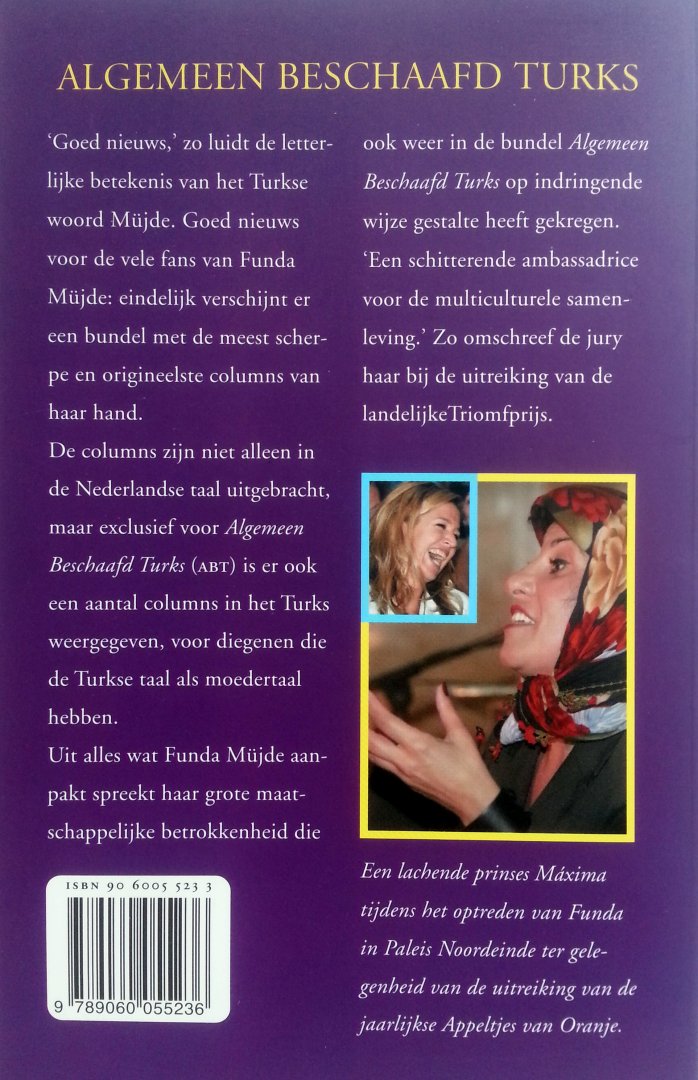 (Thomas Rap - Amsterdam) ISBN 9060055233 uitgave uit 2004 205 pp paperback ***NIEUWSTAAT*** Staat van het boek: 10.0 'Goed nieuws', zo luidt de letterlijke betekenis van het Turkse woord Müjde. Goed nieuws voor de vele fans van Funda Müjde: eindelijk verschijnt er een bundel met de meest scherpe en origineelste Telegraaf*-columns van haar hand! De columns zijn niet alleen in de Nederlandse taal uitgebracht, maar exclusief voor Algemeen Beschaafd Turks zijn er ook vijf columns in het Turks weergegeven, voor diegenen die de Turkse taal als moedertaal hebben.Recensie(s)'Algemeen Beschaafd Turks' bevat een selectie van de columns die Funda Mujde voor De Telegraaf schreef in de periode 2000 tot en met 2004. De schrijfster stelt hier een scala van zeer diverse onderwerpen aan de orde, zowel sociaal, politieke als culturele. Zij weet dit te doen op haar welbekende, relativerende manier. Maatschappijkritiek zowel als zelfkritiek spelen hier een belangrijke rol. Zij is talentvol op zeer verschillende gebieden zoals blijkt uit haar activiteiten: presentatrice, actrice (onder andere 'Vrouwenvleugel' en 'Hallo Holland'), cabaretiere en columniste. In 2002 werd zo onderscheiden met de Cosmic Award die jaarlijks wordt uitgereikt aan iemand die zich nadrukkelijk heeft onderscheiden door artistieke moed en inzet voor de multiculturele samenleving. In 2004 ontving ze uit handen van minister Verdonk de Triomfprijs, de tweejarige prijs voor de beste emancipatie en integratie. Zij is geboren in Turkije en kwam op zevenjarige leeftijd naar Nederland. De bundel bevat ook een vijftal bijdragen in de Turkse taal. Prijs €4,50 |