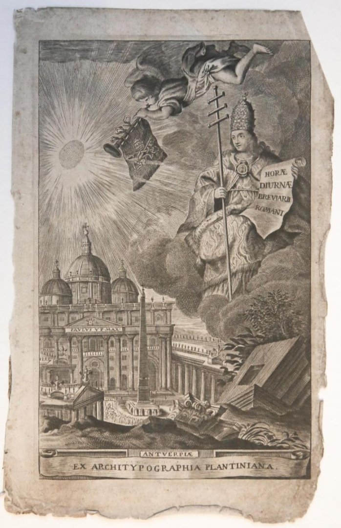 Bijzonderheden: Frontispiece and title page to a breviary published in Antwerp by Plantin Moretus.In the frontispiece, the personification of Ecclesia is sitting on the clouds on the right holding a ferula. On the other hand on the right is a descending landscape...