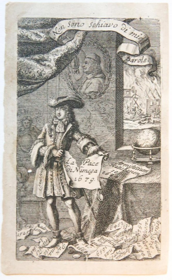 | Bijzonderheden: | Frontispiece to a book written in Italian concerning the deeds of the French nation after the peace of Nijmegen (Verdrag van Nijmegen). The treaty was signed between the United Provinces and the Reign of France the 10th of August 1678.The rare boo... |
