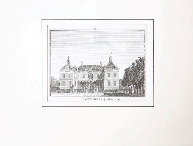 | Bijzonderheden: | Copperplate engraving/etching of ''t Huis Eeze bij Almen', in the Dutch province of Gelderland, as it appeared in 1743. This print was part of the book 'Het verheerlykt Nederland, of Kabinet van Hedendaagsche gezigten van steden, dorpen, sloten, ... |