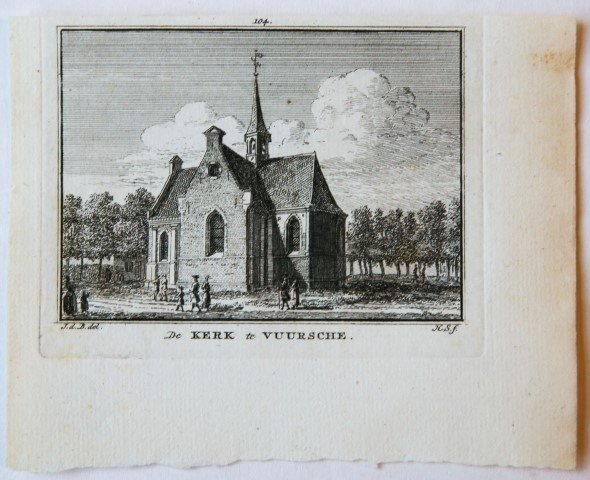 | Bijzonderheden: | Copperplate engraving/etching of 'De Kerk te Vuursche', in the Dutch province of Utrecht (1745-1774). Overall size: 106 x 134 mm; plate size: 81 x 105 mm. Very good state. Some age related discolouration. Handlaid paper. |