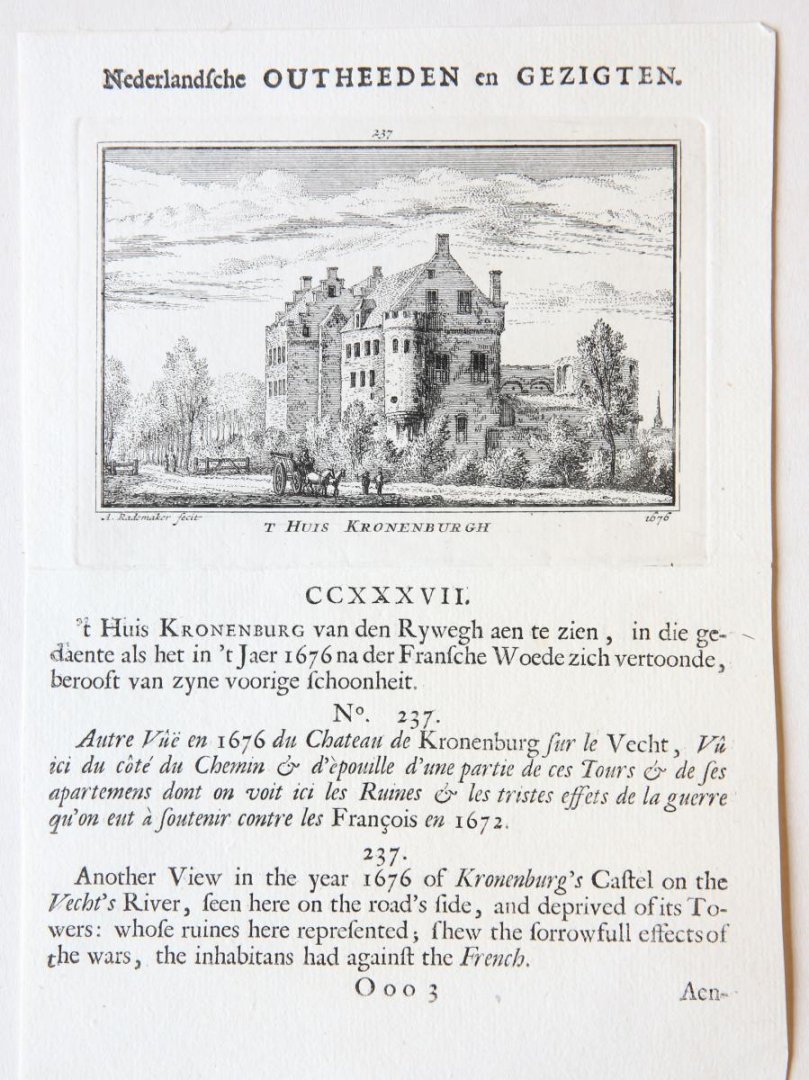 | Bijzonderheden: | Copperplate etching of ''t Huis Kronenburgh', in the Dutch province of Utrecht, as it appeared in 1676. Drawn and etched by A. Rademaker. Overall size: 194 x 136 mm; plate size: 82 x 115 mm. Very good state. Handlaid paper with watermark. With exp... |