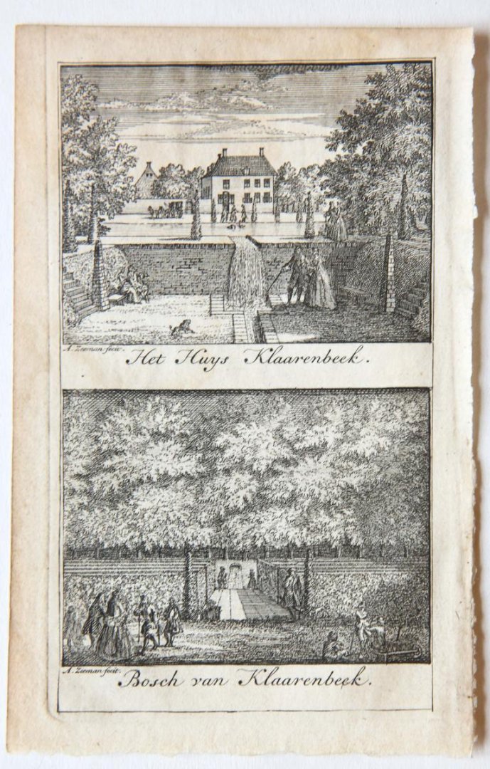 | Bijzonderheden: | Two copperplate etchings on one plate of 'Het Huys Klaarenbeek' and the 'Bosch van Klaarenbeek', in the Dutch province of Gelderland. Drawn and etched by Abraham Zeeman ca. 1730.These prints were part of the book 'Claas Bruin , Kleefsche en Zuid-H... |