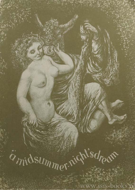 This edition of Shakespeare's Midsummer-night's Dream on Propoff paper, furnished by P. Proost & Zoon, Amsterdam, was issued in 260 copies, numbered A-J and I-XXV, each containing a double set of litho's, and 26-250. The lithographs, drawn directly on stone by Dignum Dominicus Lammers, were executed by Kunstdrukkerij v.h. J.A. Luii & Co Amsterdam, whereas the text was printed by Cloeck en Moedigh, Amsterdam. On the colophon the copy number is left blank. The colophon is signed by Dignum Lammers voor v. Gelder. Not numbered. Ex libris of Agnes van Gelder