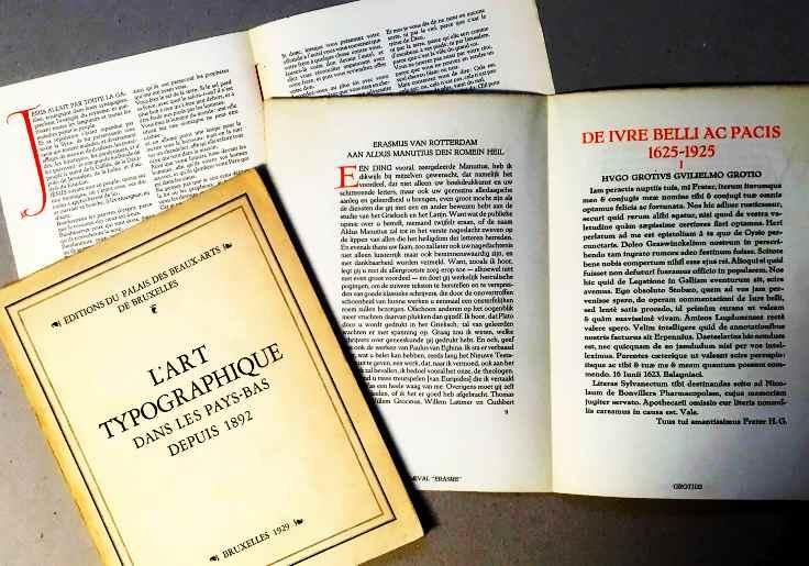 Brussel, Éditions du Palais des Beaux-Arts de Bruxelles, 1929. 26 x 19 cm. Ingenaaid. XXVI, 26, (32) p. Gedrukt op kunstdrukpapier in 450 genummerde exemplaren. Geïllustreerd. 1e druk. Rug iets versleten. Geschreven door A.A.M. Stols onder het pseudoniem Van Halsbeke. Dit is een van 50 hors-commerce-exemplaren op Astra-papier. Volgens het colofon behoren er 4 plaquettes bij dit boek als voorbeeld van de vernieuwingen in de Nederlandse drukkunst. In dit boek liggen er drie: Charles d'Orléans' Complainte de France, door Stols zelf, Les béatitudes du Saint Evangile selon Saint Matthieu, traduit sur la Vulgate par le Maistre de Saci, uitgave van Charles Nypels, een feest van blauw en rood. En Présentation des caractères dessinés par S.H. de Roos. Van Dijk 170.