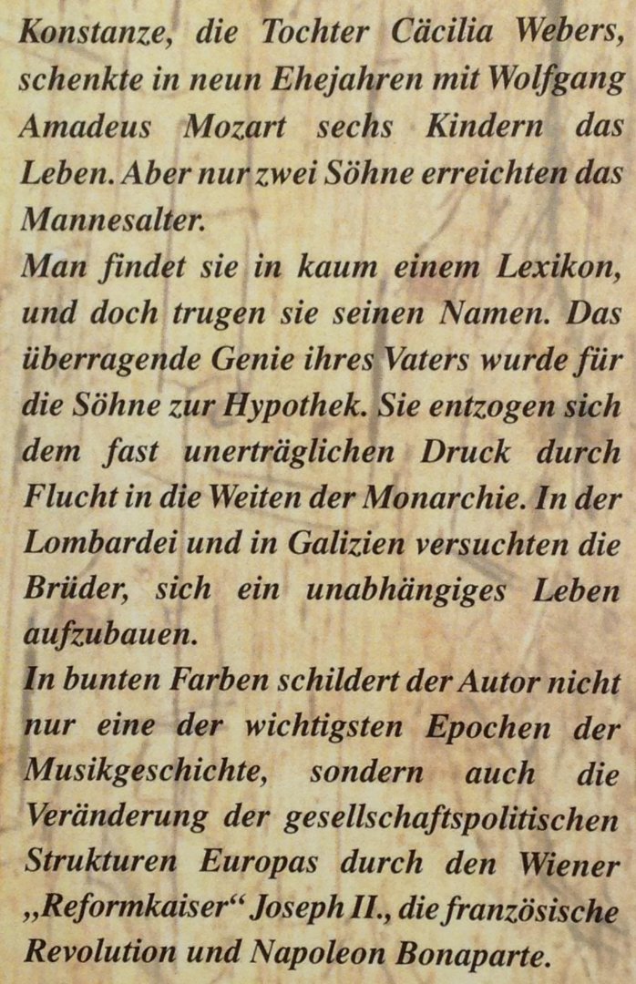 Chronik der Familie Mozart. Konstanze schenkte Mozart sechs Kinder das Leben. Nu zwei Söhne errichten das Mannesalter. sie entzogen sich dem fast unerträglichen Druck Mozarts durch Flucht in die Weiten des Monarchie. |