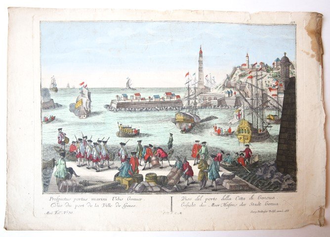 | Meer info: | Beautifully hand coloured optical view of the Italian harbor of Genoa as seen from land. In the foreground, soldiers and merchants make themselfs ready to go on board the ships. Behind the dock ships are leaving the harbor. On the right a small piece of the city is visible. |
