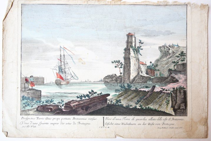 | Bijzonderheden: | Georg Balthasar Probst, Augsbourg. ca. 1760. 35 x 51 cm (plate: 32,5 x 43 cm). Handcoloured copperplate engraving on handlaid paper with watermark.Prospectus Turris illius prope portum Britaniae versus (...), Med. Fol. No. 25. C.P.S.C.M. Georg Bal... |