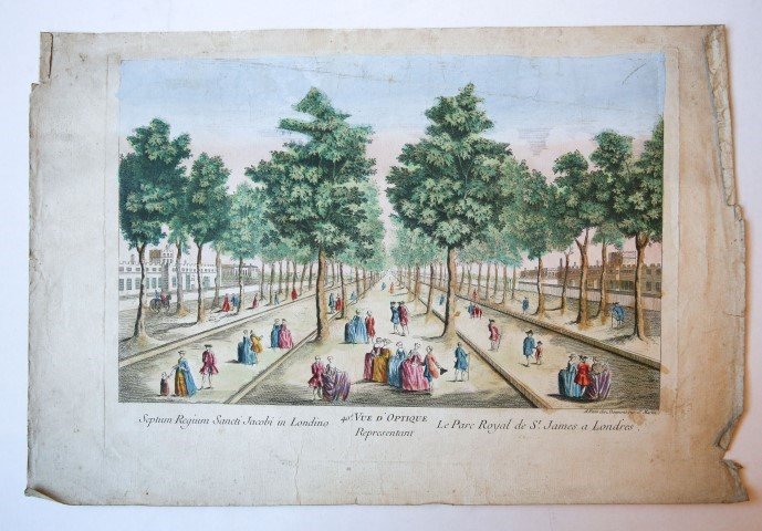 | Meer info: | A hand coloured optical view of Saint James Park in London. The oldest royal park of the city. Well-dressed bourgeoisie populate the park. |