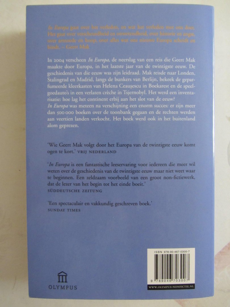| Meer info: | Neerslag van een reis die Geert Mak maakte door Europa in het laatste jaar van de twintigste eeuw. De geschiedenis van die eeuw was zijn leidraad. |