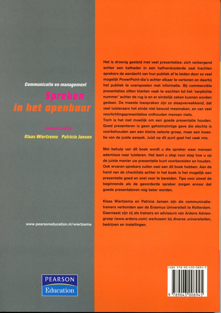 ![Wiertzema, Klaas/ Jansen, Patricia - Spreken in het openbaar [Communicatie en management]. Tweede editie Wiertzema, Klaas/ Jansen, Patricia - Spreken in het openbaar [Communicatie en management]. Tweede editie](https://images.boekwinkeltjes.nl/medium/HB8UVRmJLgyV135EAPUF.jpg)