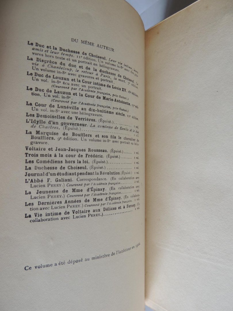 1924. 1e druk. Halfleder met 5 Ribben. 467 blz. Le Duc et la Duchesse de Choiseul : leur vie intime, leurs amis et leur temps.