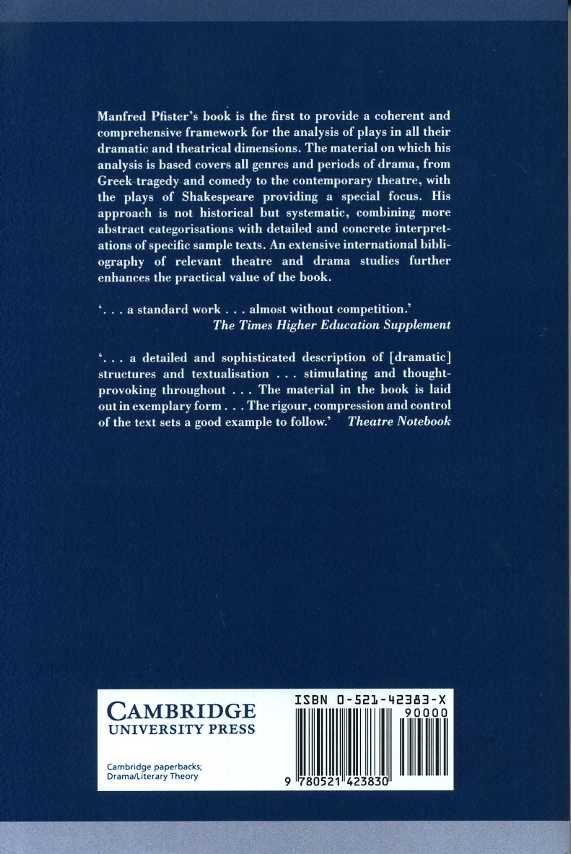 Manfred Pfister's book is the first to provide a coherent and comprehensive framework for the analysis of plays in all their dramatic and theatrical dimensions. The materical on which his analysis is based covers all genres and periods of drama, from Greek tragedy and comedy to the contemporary theatre, with the plays of Shakespeare providing a special focus. His approach is not historical but systematic, combining more abstract categorisations with detailed and concrete interpretations of specific sample texts. An extensive international bibliography of relevant theatre and drama studies further enhances the practical value of the book.