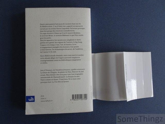 Quatre amis passent huit jours de vacances dans une île de Méditerranée. L'un d'entre eux a apporté un manuscrit envoyé par un certain Simon Laquedem. Sa lecture provoque dans leur groupe des réactions contradictoires. Un ange annonce à Simon qu'il est le nouvel Abraham, le nouveau Moïse, le nouveau Mahomet et que Dieu insiste pour lui parler. Dieu lui apparaît et lui raconte avec simplicité et clarté, parfois avec gaieté, les origines de l'univers, le big-bang, l'espace et le temps, l'eau, l'air, la lumière, la vie si tragiquement passagère des hommes, leur pensée et leur histoire, les dramaturgies du savoir, de l'ambition, de l'amour et du sexe. Entre Bible et bande dessinée, entre texte sacré et canular, cette odyssée allègre de l'esprit universel remplacera avantageusement toutes les bibliothèques imaginaires et réelles.