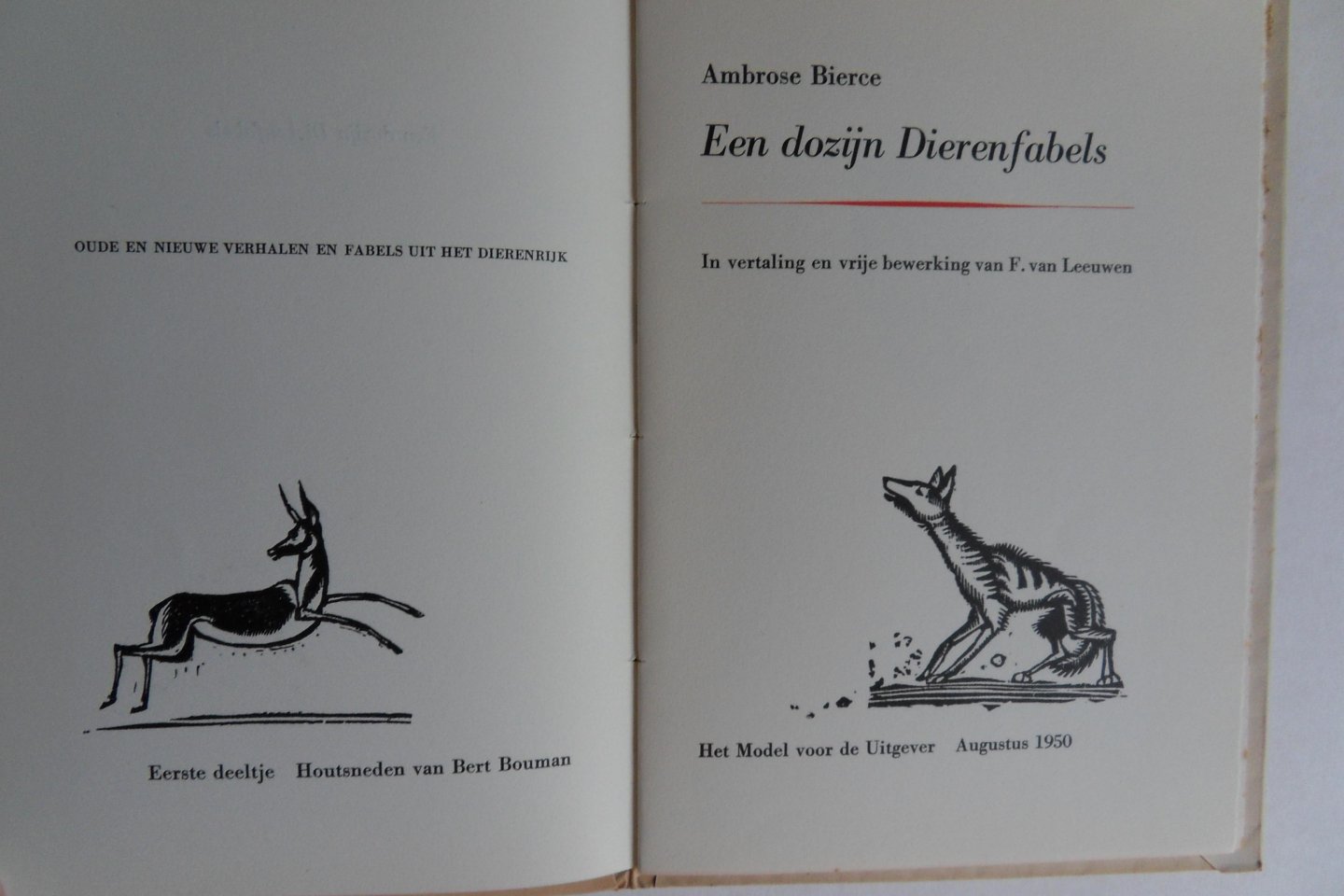 ![Bierce, Ambrose. [ in vertaling en vrije bewerking van F. van Leeuwen ]. - Een Dozijn Dierenfabels. [ met houtsneden van Bert Bouman ]. [ + BIJLAGE ]. Bierce, Ambrose. [ in vertaling en vrije bewerking van F. van Leeuwen ]. - Een Dozijn Dierenfabels. [ met houtsneden van Bert Bouman ]. [ + BIJLAGE ].](https://images.boekwinkeltjes.nl/medium/LBZXsLaxOm6yOSSQRi58.jpg)