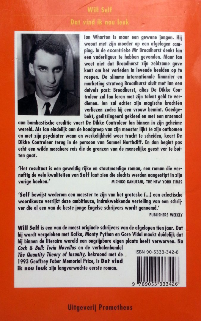 (Prometheus - Amsterdam) ISBN 9053333428 uitgave uit 1995 301 pp paperback (in goede staat, iets verkleuring) Staat van het boek: 7.0 De jonge Engelse schrijver Will Self maakt al enige jaren furore met zijn absurdistische korte verhalen. Deze debuutroman beschrijft de 'opvoeding' van een jongeman tot instrument van de duivel. De jongeman is Ian Wharton, een dikkige, kleurloze knaap die echter het vermogen bezit ieder beeld dat voor zijn geestesoog verschijnt binnen te treden en daar van allerlei streken uit te halen. De duivel, in de persoon van de lijvige, eeuwig sigaren paffende Broadhurst, helpt Wharton dit vermogen verder te ontwikkelen en krijgt hem zo volledig in zijn greep. Het gevolg: vele wetsovertredingen. Het boek is bijzonder knap geschreven en zit vol zwarte humor, maar laat toch vooral een beklemd gevoel achter. Op de vertaling is niets aan te merken. Eerder verscheen van Self de verhalenbundel 'The Quantity Theory of Insanity'. (Biblion recensie, Andries Rodenboog.) Prijs €4,- |