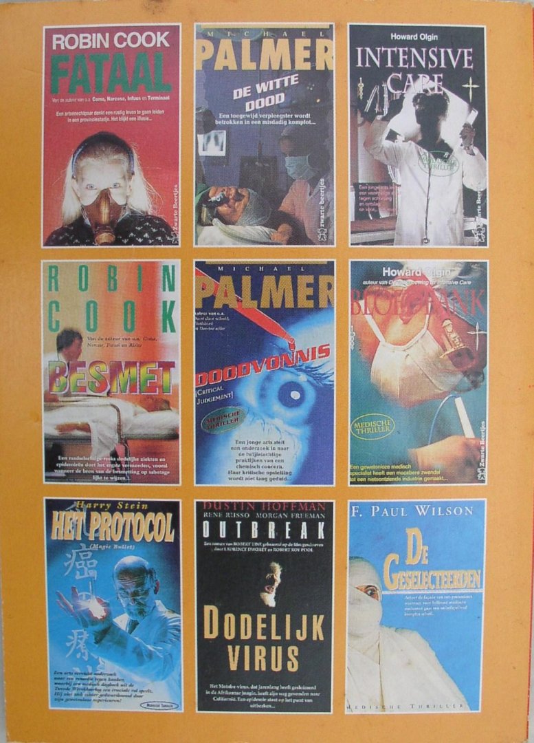 | Bijzonderheden: | De huiveringwekkende aspecten van de moderne medische wereld volgens de boeken van 'specialisten' als Robin Cook, Howard Olgin, Mihael Palmer en anderen. 1997., paperback, softcover, 14 cm., 47 pag. |