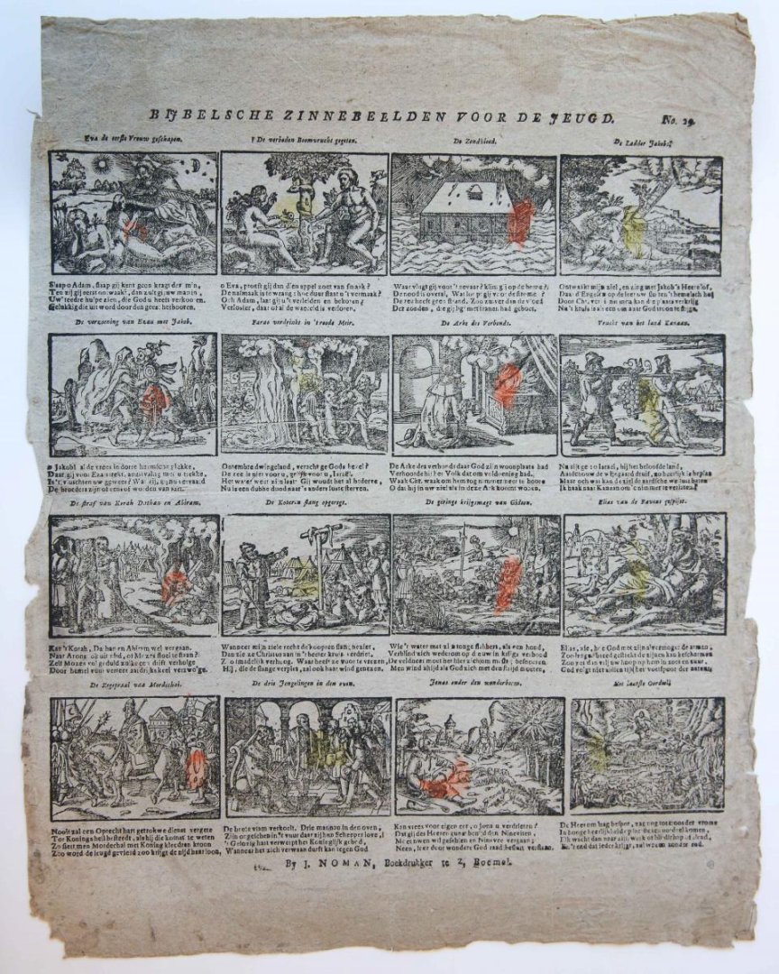 16 woodcut illustrations (each ca. 50 x 75 mm) on handmade paper; woodblocks from the 17th or 18th century; hand coloured in orange and yellow; 4-line verses under each image; total: 410 x 325 mm; watermark: ‘J Pannekoek’; frayed edges, left margin cut off. De Meyer p. 244, Boerma p. 791 (Noman 43).