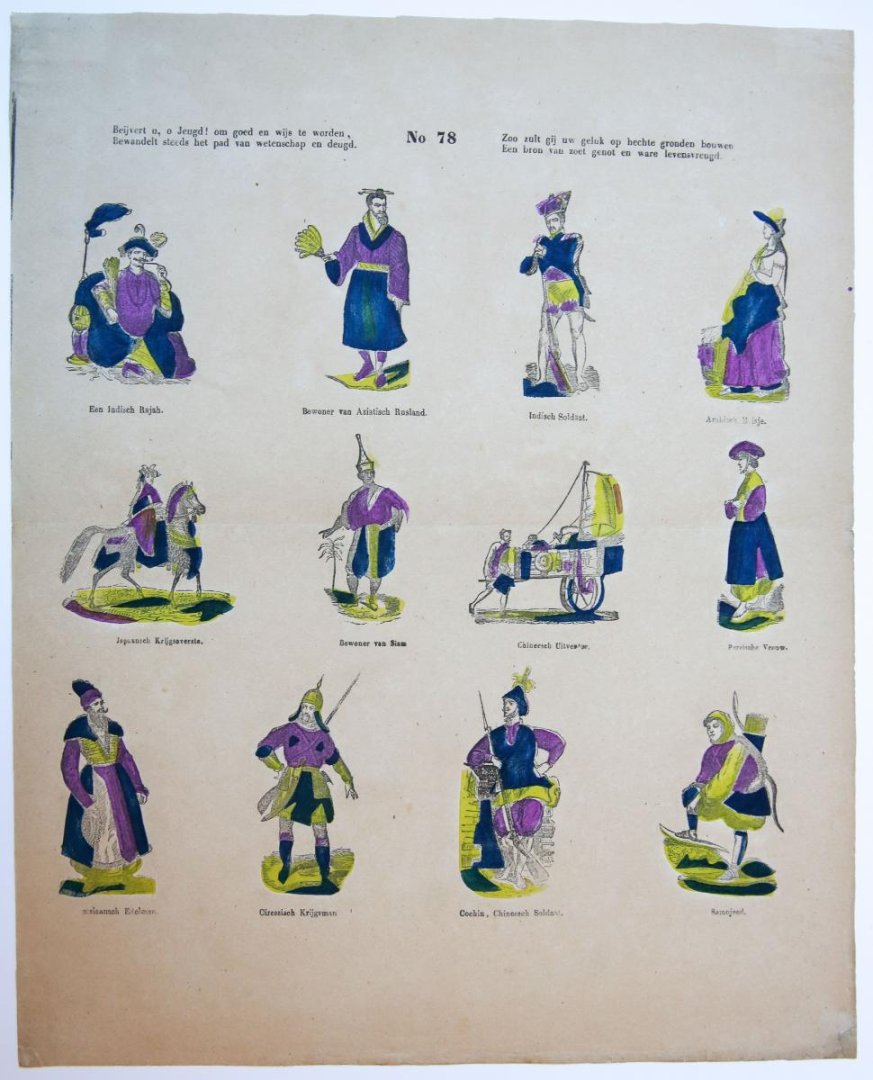 | Bijzonderheden: | Popular print with 12 images of Asiatic people, such as an Indian Rajah, an Indian Soldier, an Arab girl, a Samoyede (Samojeed), and people from Kochi / Cochin and Siam.Den Bosch, Lutkie & Cranenburg (1848 – 1881), numbered ‘No 78.’ in the top. |