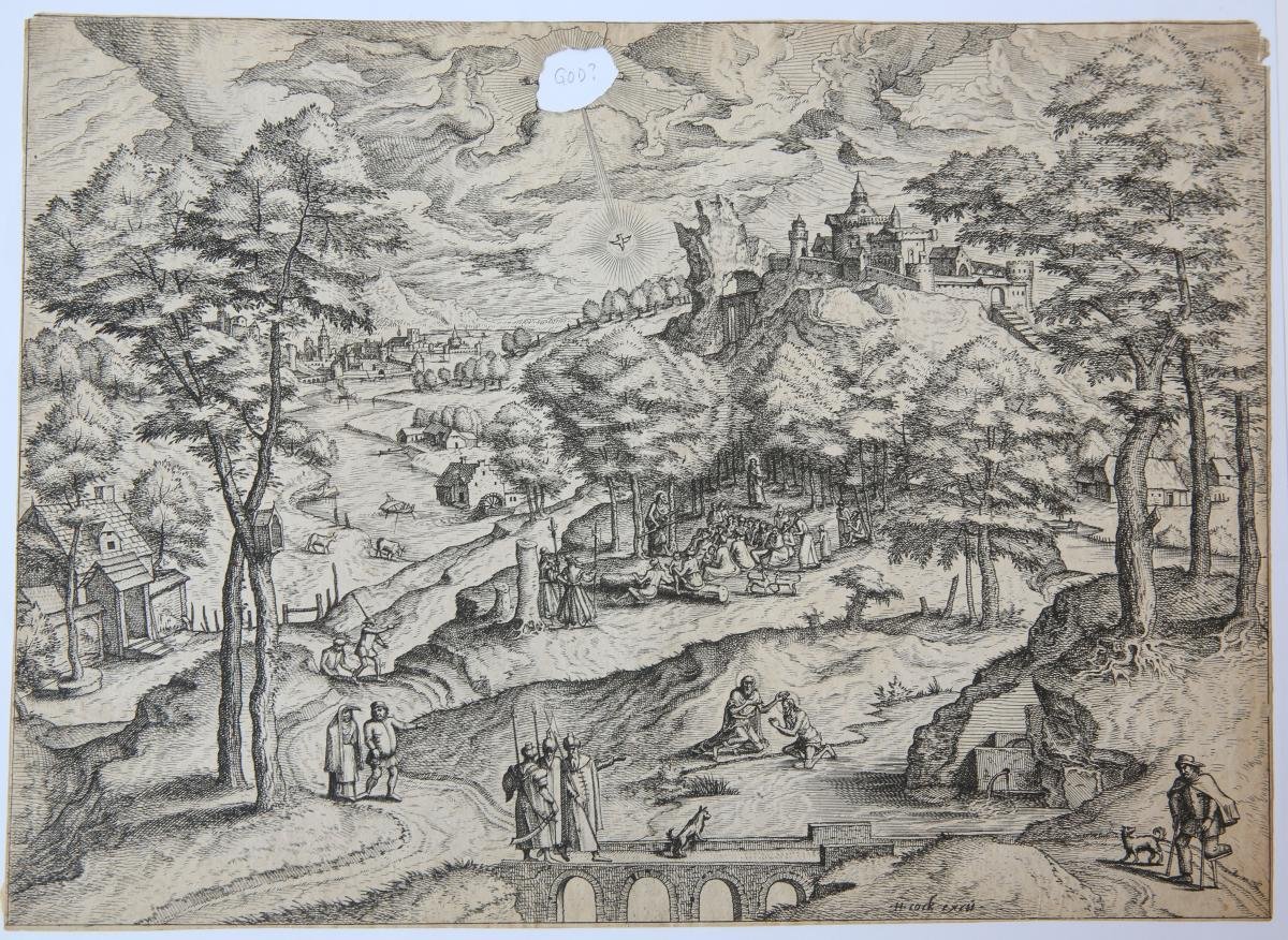 | Bijzonderheden: | Hilly and mountainous landscape with villages and castle and St. John Baptizing Christ on the Jordan river, on the right. From a set of five Landscapes with Biblical subjects and Saints.Signed on the bottom right: 'h cock excu'. The figure of God ... |