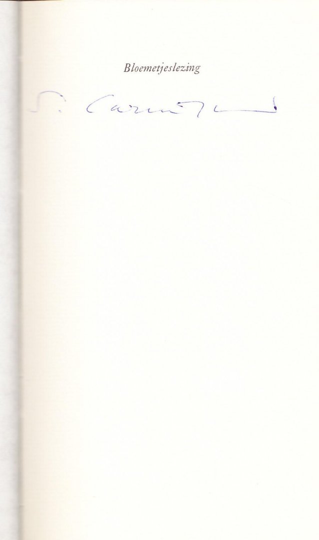Keurig exemplaar (74/250), door Carmiggelt gesigneerd met ballpoint op franse titel. Slechts 250 exemplaren van de eerste oplage werden gebonden, genummerd en door Carmiggelt gesigneerd en bleven hors commerce; de gewone paperback toont de blauw gedrukte signatuur onder het 'Voorberichtje'. Kreukje ontstaan bij binden pag. 56-57. Schaars aanbod.