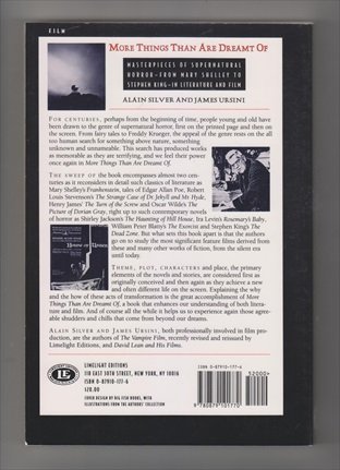 More things than are dreamt of. Masterpieces of Supernatural Horror - from Mary Shelley to Stephen King - in Literature and Film. Limelight Editions, New York. 1994. First edition thus. Paperback (softcover). 226 pages. 15,5 x 24,25 1,75 cm. 432 gr. ISBN-0 0-87910-177-6. ISBN-13 978-0-87910-177-0. Cover design by Big Fish Books. With black and white illustrations from the authors' collection. Preface by William Peter Blatty. "The sweep of the book encompasses almost two centuries as it reconsiders in detail such classics of literature as Mary Shelley's Frankenstein, tales of Edgar Allan Poe, Robert Louis Stevenson's The Strange Case of Dr. Jekyll and Mr. Hyde, Henry James' The Turn of the Screw and Oscar Wilde's The Picture of Dorian Gray, right up to such contemporary novels of horror as Shirley Jackson's The Haunting of Hill House, Ira Levin's Rosemary's Baby, William Peter Blatty's The Exorcist and Stephen King's The Dead Zone. But what sets this book apart is that the authors go on to study the most significant feature flms derived from these and many other works of fiction, from the silent era until today." Slight curling to covers, but no other significant wear; clean inside and out. Near Fine. BOOKNUMBER: 20993 |