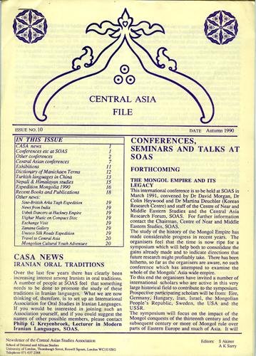 | Meer info: | Newsletter of the Central Asian Studies Association With news about conferences, exhibitions, books, publications, orbituaries and other as well as a Dictionary of Manichaen Terms, Turkish Languages in China and Expedition Mongolia 1990. |