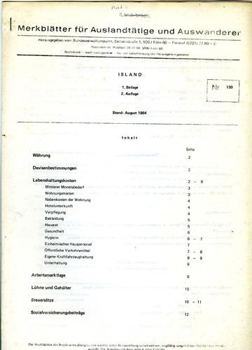 | Meer info: | Merkblatter fur Auslandtatige und Auswanderer. Stapled information on Iceland. |