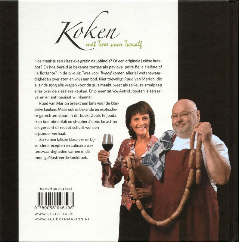 Flaptekst: Hoe maak je een klassieke gratin dauphinois? Of een originele Leidse hutspot? En hoe bereid je bekende toetjes als pavlova, poire belle Hélène of ile flottante? In de tv-quiz Twee voor Twaalf komen allerlei wetenswaardigheden over eten en wijn aan bod. Niet toevallig: Ruud van Marion, die al sinds 1993 alle vragen voor de quiz maakt, weet als serieuze smulpaap alles over de klassieke keuken. En presentatrice Astrid Joosten is een ervaren en enthousiast wijnkenner. Ruud van Marion breekt een lans voor de klassieke keuken. Maar ook onbekende en exotische gerechten staan in dit boek. Zoals feijoada, ikan boemboe Bali en sheperd's pie. En achter elk gerecht of recept schuilt wel een bijzonder verhaal. Zo komen talloze klassieke en bijzondere recepten en culinaire wetenwaardigheden samen in dit mooi geïllustreerde boek.