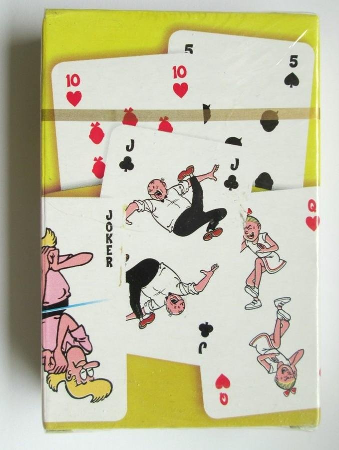 | Meer info: | Stok speelkaarten (52 kaarten plus 2 jokers) met beeltenissen van Suske & Wiske, Lambik, Jerom, Tante Sidonia en Professor Barabas. |
