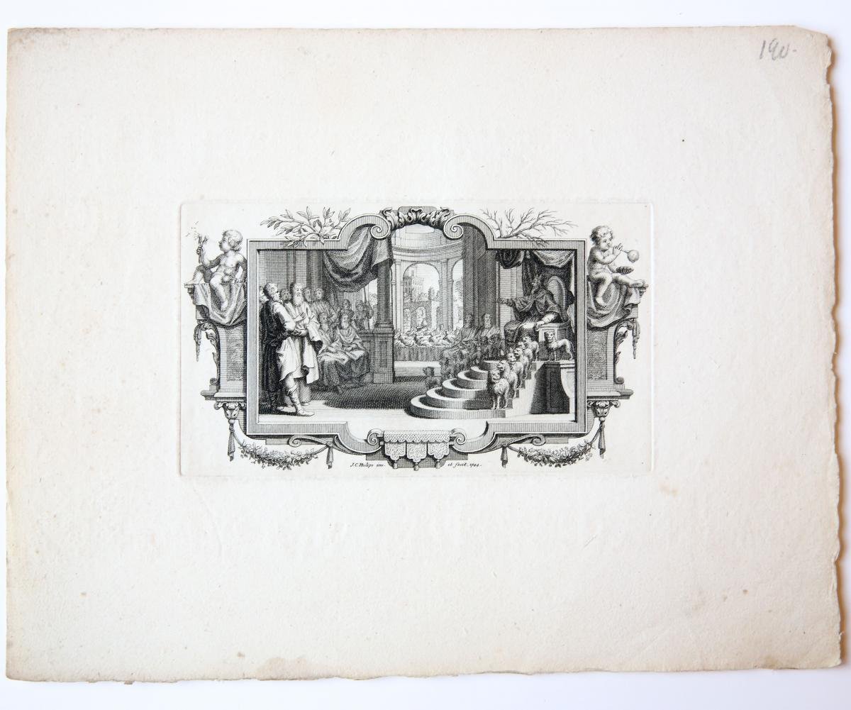 | Bijzonderheden: | Vignette with King Solomon on the throne.Signed and dated on bottom: 'J.C. Philips inv. et fecit 1744'.[NL] Vignet met Koning Salomo op de troon. |