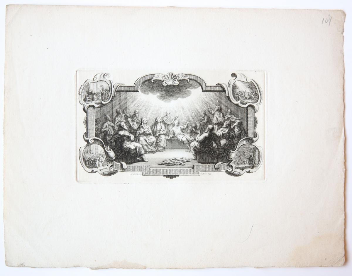 | Titel: | Antique print, etching and engraving | Pentecost (Pinksteren), published 1753, 1 p. |