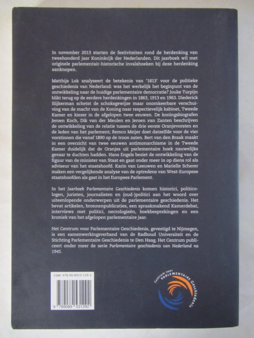 In november 2013 starten de festiviteiten rond de herdenking van tweehonderd jaar Koninkrijk der Nederlanden. Dit jaarboek wil met originele parlementair-historische invalshoeken bij deze herdenking aanknopen.Matthijs Lok analyseert de betekenis van '1813' voor de politieke geschiedenis van Nederland: was het werkelijk het beginpunt van de ontwikkeling naar de huidige parlementaire democratie? Jouke Turpijn blikt terug op de eerdere herdenkingen in 1863, 1913 en 1963. Diederick Slijkerman schetst de schoksgewijze maar onomkeerbare verschuiving van de macht van de Koning naar respectievelijk kabinet, Tweede Kamer en kiezer in de afgelopen twee eeuwen. De koningsbiografen Jeroen Koch, Dik van der Meulen en Jeroen van Zanten beschrijven de ontwikkeling van de relatie tussen de drie eerste Oranjevorsten en de leden van het parlement; Remco Meijer doet datzelfde voor de vier vorstinnen die vanaf 1890 op de troon zaten. Bert van den Braak maakt in een overzicht van twee eeuwen antimonarchisme in de Tweede Kamer duidelijk dat de Oranjes uit parlementaire hoek nauwelijks gevaar te duchten hadden. Hans Engels beziet de ontwikkeling van de figuur van de minister van Staat en gaat onder meer in op diens rol als adviseur van het staatshoofd. Karin van Leeuwen en Marielle Scherer maken een vergelijkende analyse van de optredens van West-Europese staatshoofden als gast in het Europees Parlement. In het Jaarboek Parlementaire Geschiedenis komen historici, politicologen, juristen, journalisten en (oud-)politici aan het woord over uiteenlopende onderwerpen uit de parlementaire geschiedenis. Het bevat artikelen, bronnenpublicaties, een spraakmakend Kamerdebat, interviews met politici, necrologieën, boekbesprekingen en een kroniek van het afgelopen parlementaire jaar.Het Centrum voor Parlementaire Geschiedenis, gevestigd te Nijmegen, is een samenwerkingsverband van de Radboud Universiteit en de Stichting Parlementaire Geschiedenis te Den Haag. Het Centrum publiceert onder meer de serie Parlementaire geschiedenis van Nederland na 1945. |