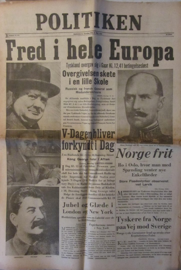 | Meer info: | Deenstalige krant bij de bevrijding en het einde van de Tweede Wereldoorlog in Europa. Op de voorpagina foto's van de Deense koning en de Engelse premier Churchill. Interessant collectors item! Prijs inclusief verzending binnen Nederland. |