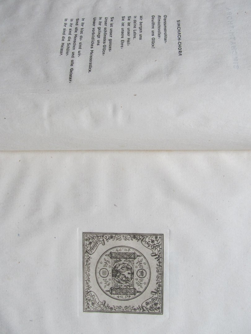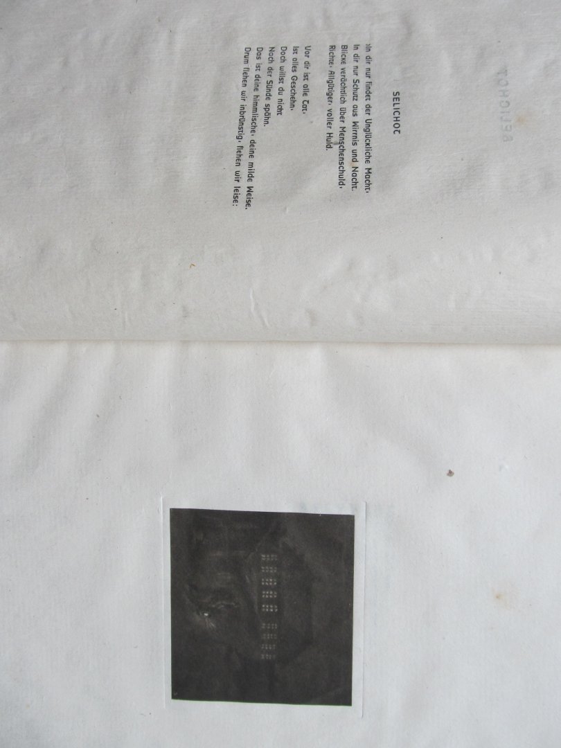 The 'Radierungen' are reproduced by tipped-in heliogravures, except for the first one (frontispice) which is an original woodcut. The poems relate to jewish holidays. |